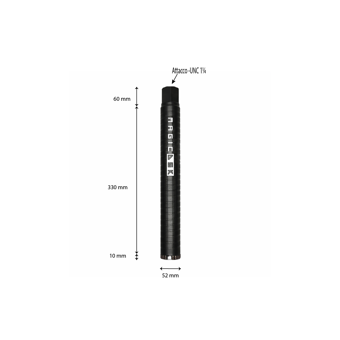 Corona Laser TOP LINE FT-330TL Ø 52 mmMagicDSK FT52330TL Corona diamantata serie TOP LINE a saldatura laser professionale, Ø 52 mm, attacco UNC 1 ¼, settore H 10 mm, carotaggio max 320 mm, taglio a secco/acqua: cemento armato, granito, laterizi, pietra
