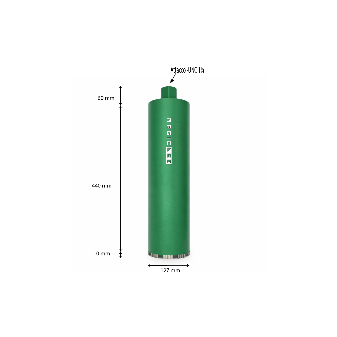 Corona Laser FT-450 Ø 127 mmMagicDSK FT127450 Corona diamantata a saldatura laser professionale, Ø 107 mm, attacco UNC 1 ¼, settore H 10 mm, carotaggio max 440 mm, taglio ad acqua (o a secco con avanzamento lento): cemento armato, laterizi, pietra