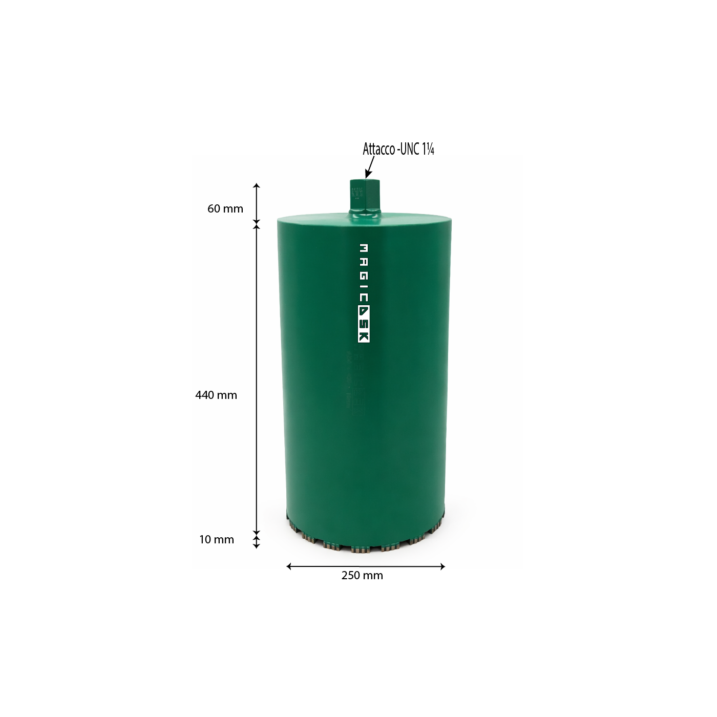 Corona Laser FT-450 Ø 250 mmMagicDSK FT250450 Corona diamantata a saldatura laser professionale, Ø 250 mm, attacco UNC 1 ¼, settore H 10 mm, carotaggio max 440 mm, taglio ad acqua (o a secco con avanzamento lento): cemento armato, laterizi, pietra