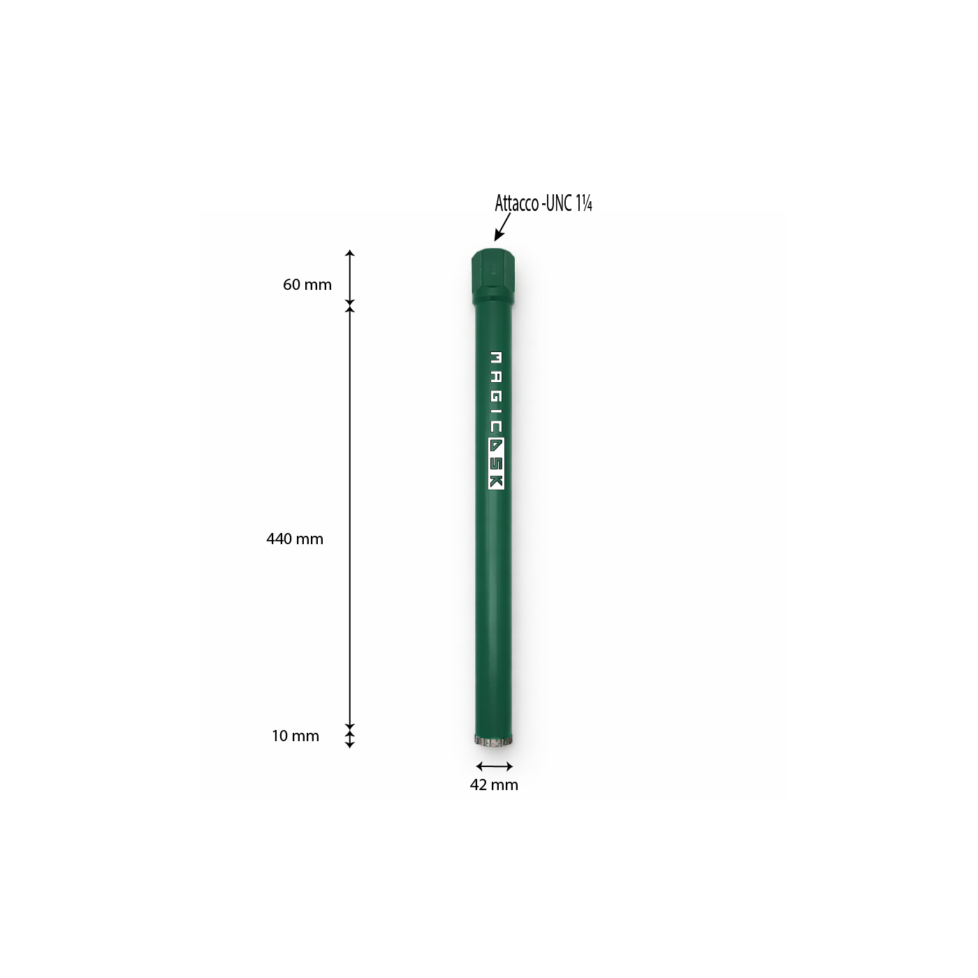 Corona Laser FT-450 Ø 42 mmMagicDSK FT42450 Corona diamantata a saldatura laser professionale, Ø 42 mm, attacco UNC 1 ¼, settore H 10 mm, carotaggio max 440 mm, taglio ad acqua (o a secco con avanzamento lento): cemento armato, laterizi, pietra
