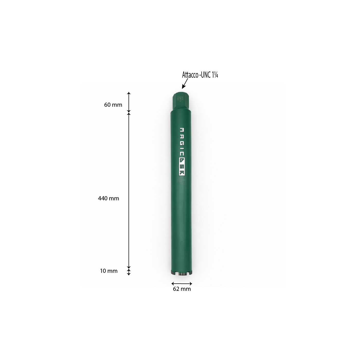 Corona Laser FT-450 Ø 62 mmMagicDSK FT62450 Corona diamantata a saldatura laser professionale, Ø 62 mm, attacco UNC 1 ¼, settore H 10 mm, carotaggio max 440 mm, taglio ad acqua (o a secco con avanzamento lento): cemento armato, laterizi, pietra