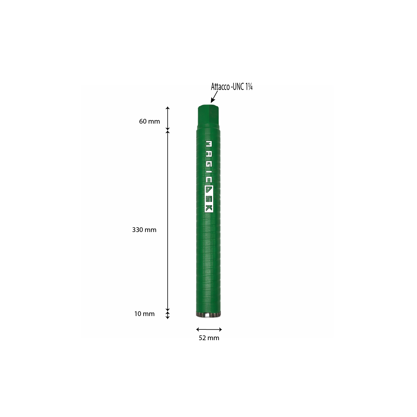 Corona Laser FT-330 Ø 52 mmMagicDSK FT52330 Corona diamantata a saldatura laser professionale, Ø 52 mm, attacco UNC 1 ¼, settore H 10 mm, carotaggio max 330 mm, taglio a secco/acqua: cemento armato, granito, laterizi, pietra