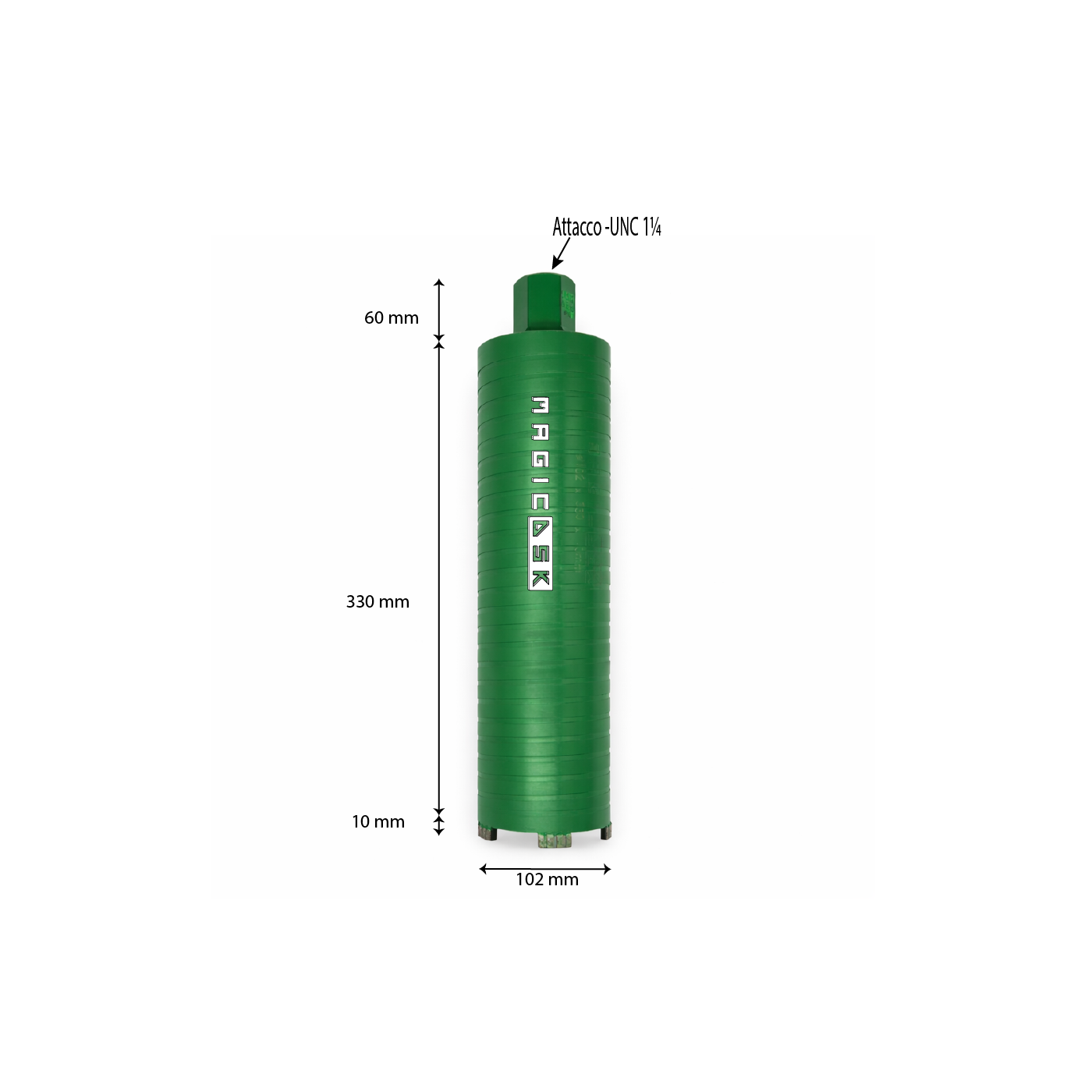 Corona Laser FT-330 Ø 102 mmMagicDSK FT102330 Corona diamantata a saldatura laser professionale, Ø 102 mm, attacco UNC 1 ¼, settore H 10 mm, carotaggio max 330 mm, taglio a secco/acqua: cemento armato, granito, laterizi, pietra