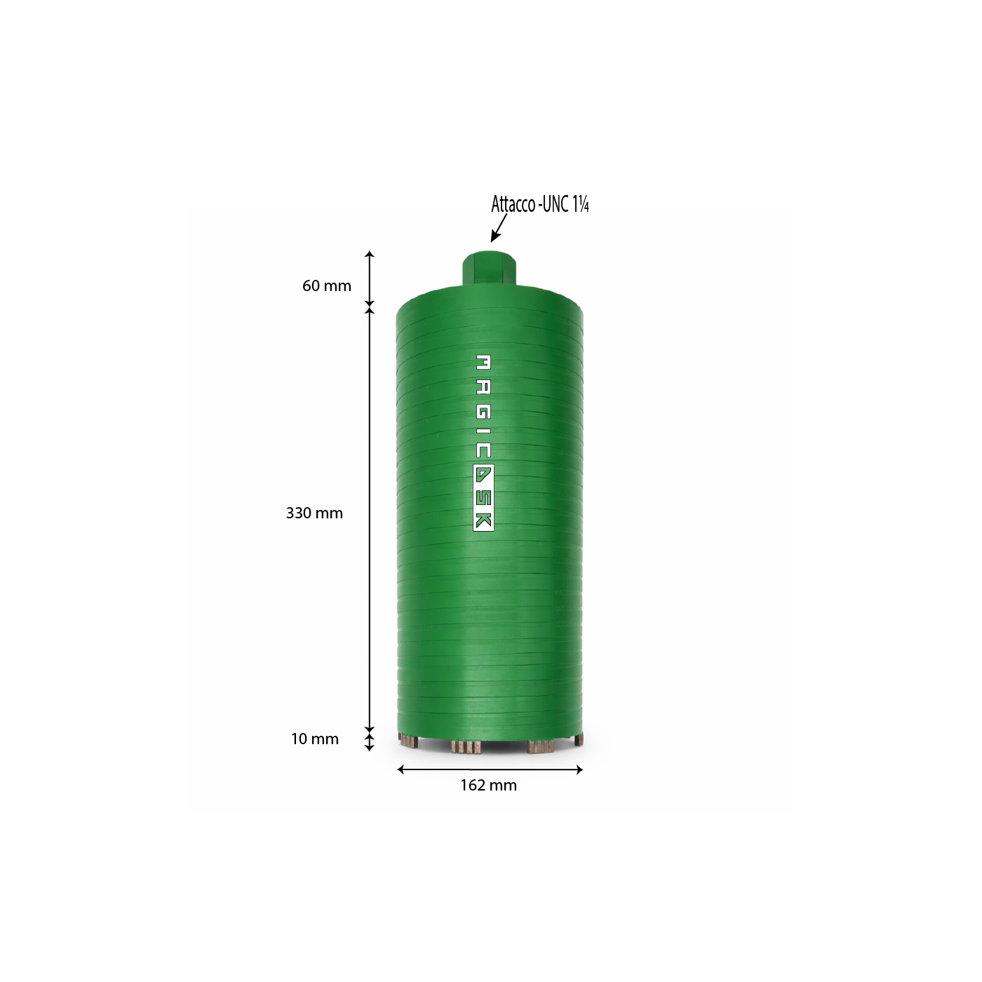 Corona Laser FT-330 Ø 162 mmMagicDSK FT162330 Corona diamantata a saldatura laser professionale, Ø 162 mm, attacco UNC 1 ¼, settore H 10 mm, carotaggio max 330 mm, taglio a secco/acqua: cemento armato, granito, laterizi, pietra