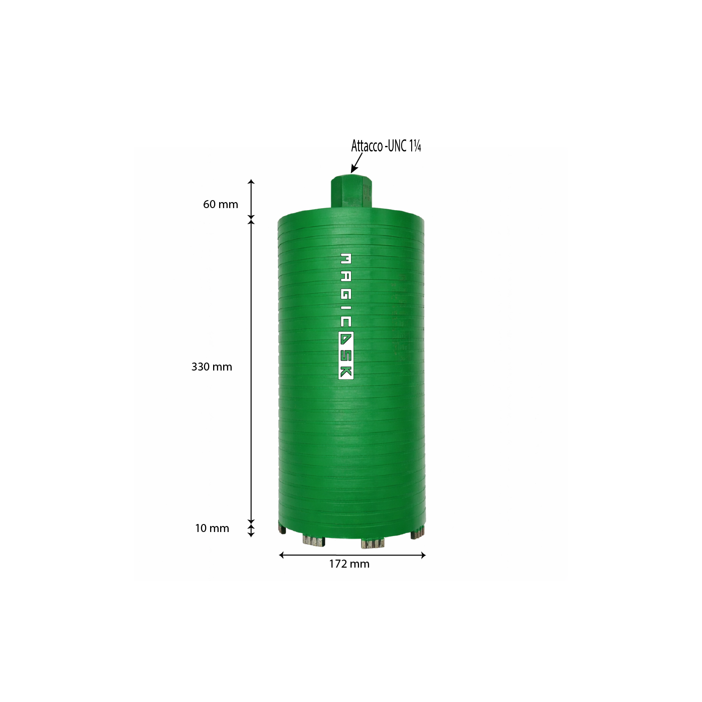 Corona Laser FT-330 Ø 172 mmMagicDSK FT172330 Corona diamantata a saldatura laser professionale, Ø 172 mm, attacco UNC 1 ¼, settore H 10 mm, carotaggio max 330 mm, taglio a secco/acqua: cemento armato, granito, laterizi, pietra