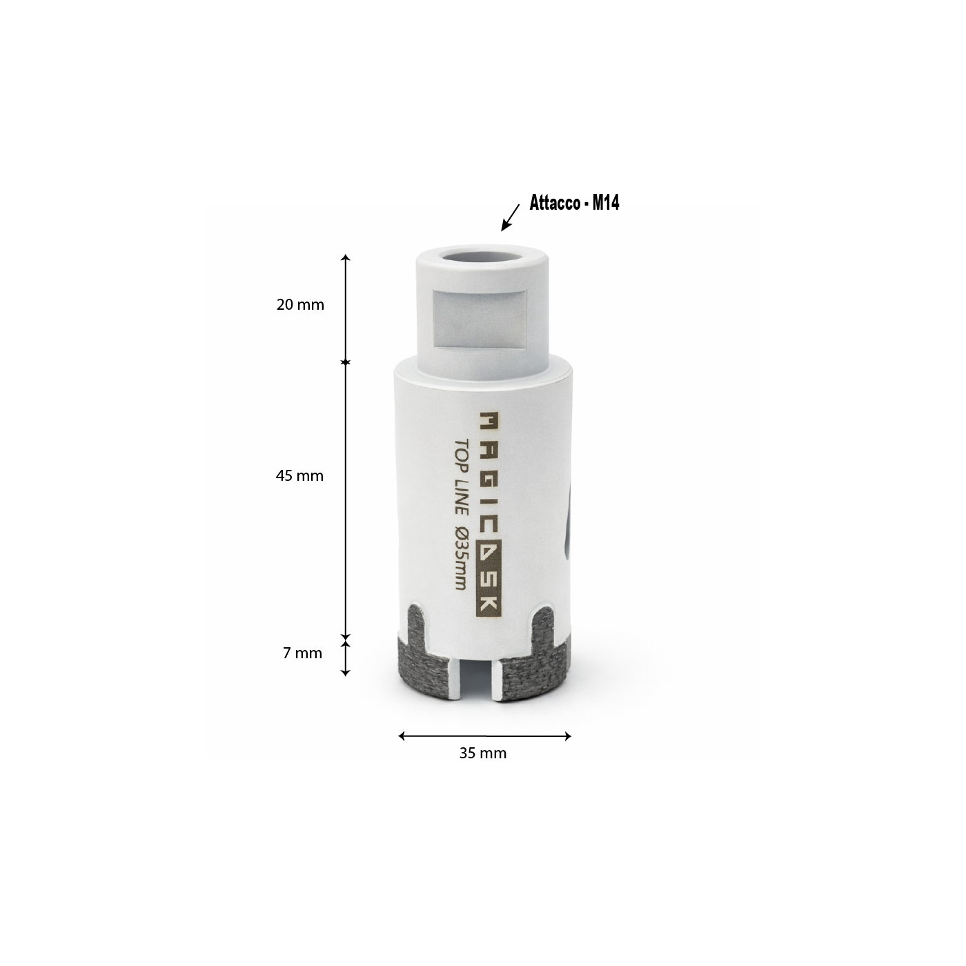 Foretti Sinterizzati FSV Ø 35 mmMagicDSK FSV3570 Foretto Ultra Durata professionale, Ø 35 mm, attacco M14, settore H 7 mm, carotaggio 45 mm, taglio a secco/acqua: dekton, okite, gres porcellanato, quarzite, granito, ceramica, cemento.