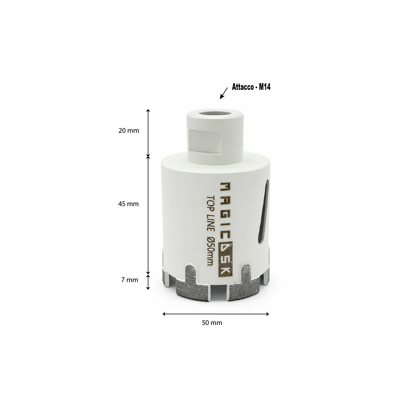 Foretti Sinterizzati FSV Ø 50 mmMagicDSK FSV5070 Foretto Ultra Durata professionale, Ø 50 mm, attacco M14, settore H 7 mm, carotaggio 45 mm, taglio a secco/acqua: dekton, okite, gres porcellanato, quarzite, granito, ceramica, cemento.
